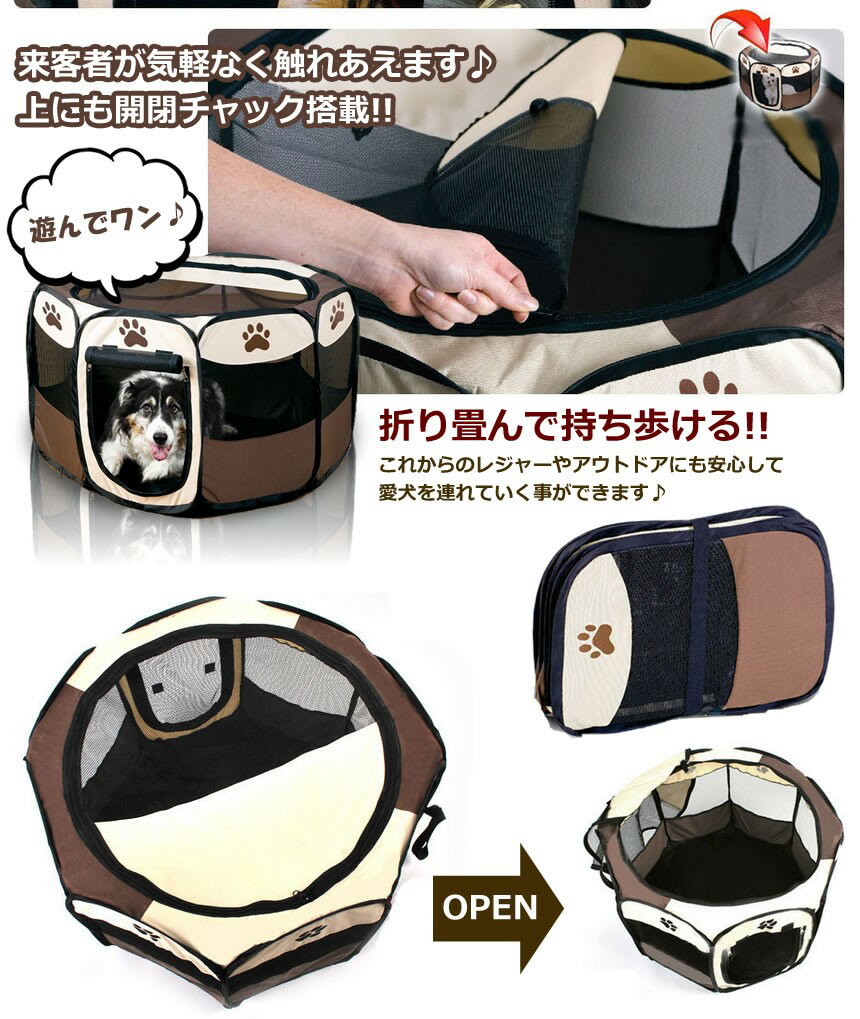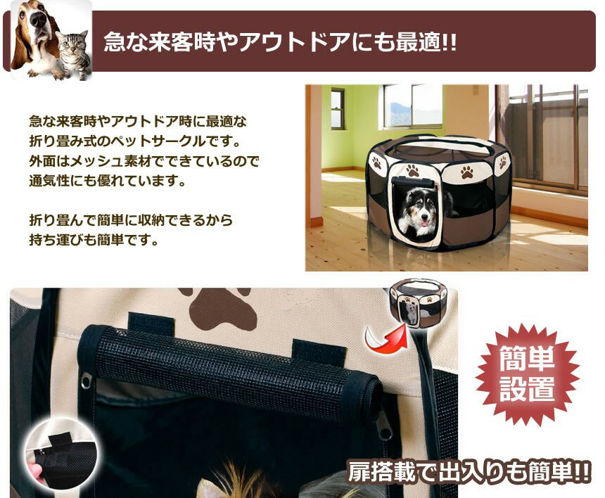 ※沖縄県及び一部離島への発送は行っておりません 予めご了承ください) 折り畳み簡単!!急な来客時やアウトドアにも最適!! ファスナー式だから愛犬が逃げ出さない!! 急な来客時やアウトドア時に最適な折り畳み式のペットサークルです。
