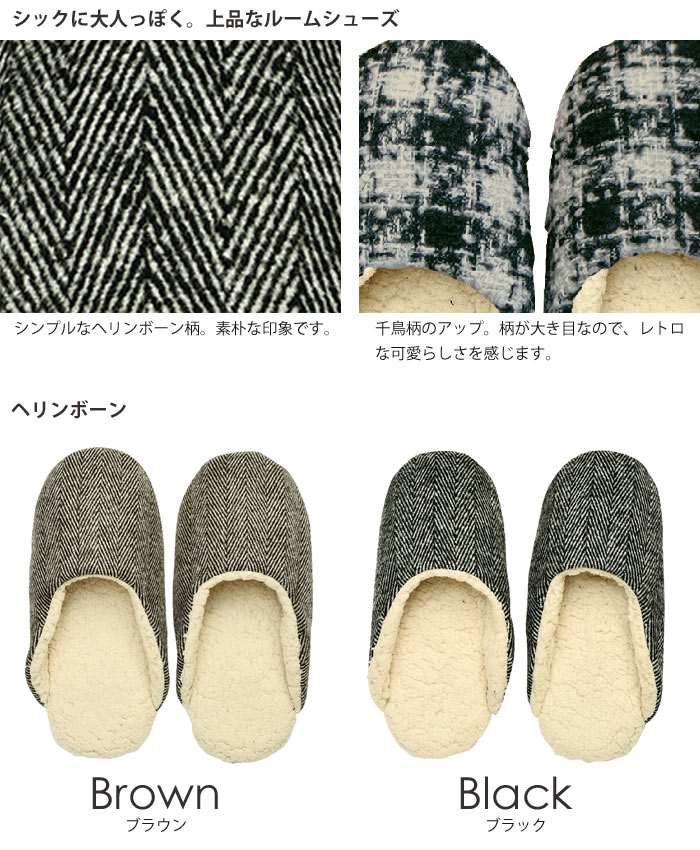 シンプルなヘリンボーン柄と、大き目の千鳥格子柄の2パターンがあるル ームシューズ。